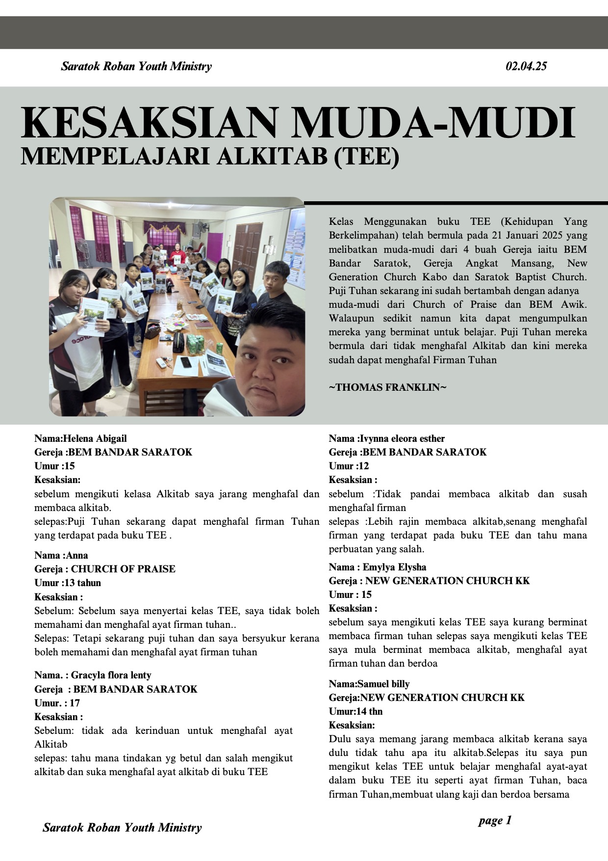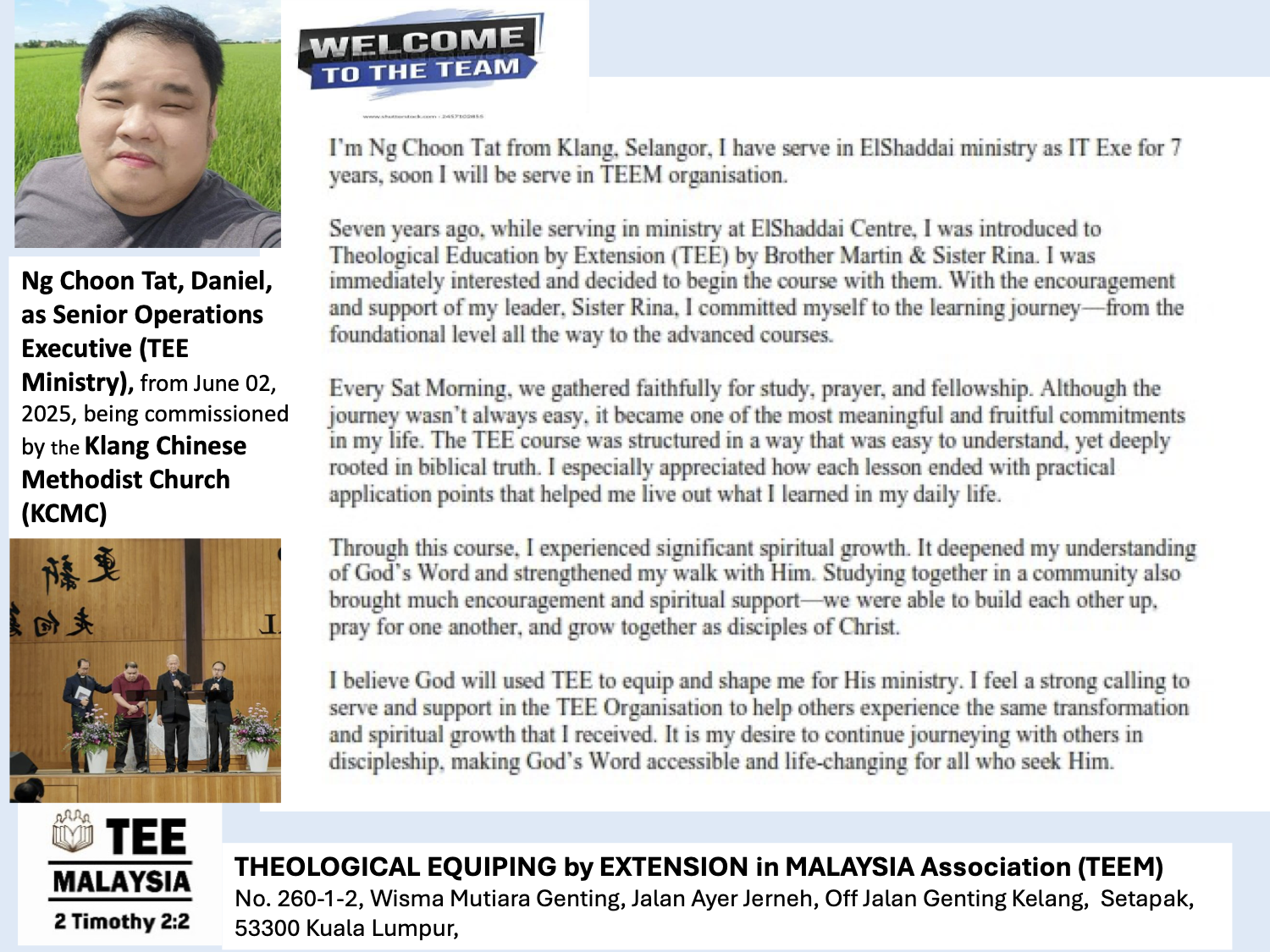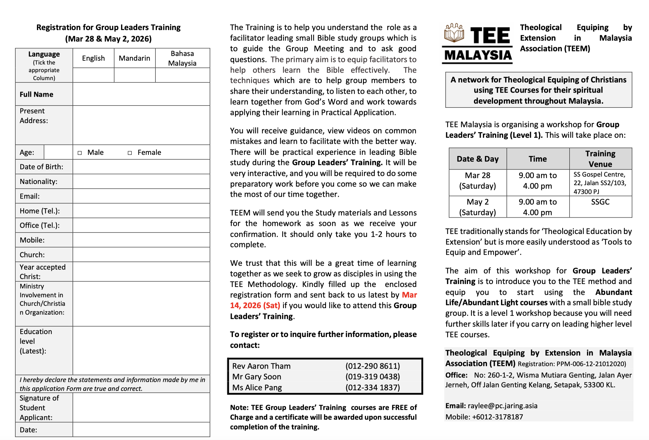 TEE is a church-based training approach that equips disciples and leaders in the context of their daily lives, through local learning groups (bible study) which combine the three elements in a structured pattern of learning.